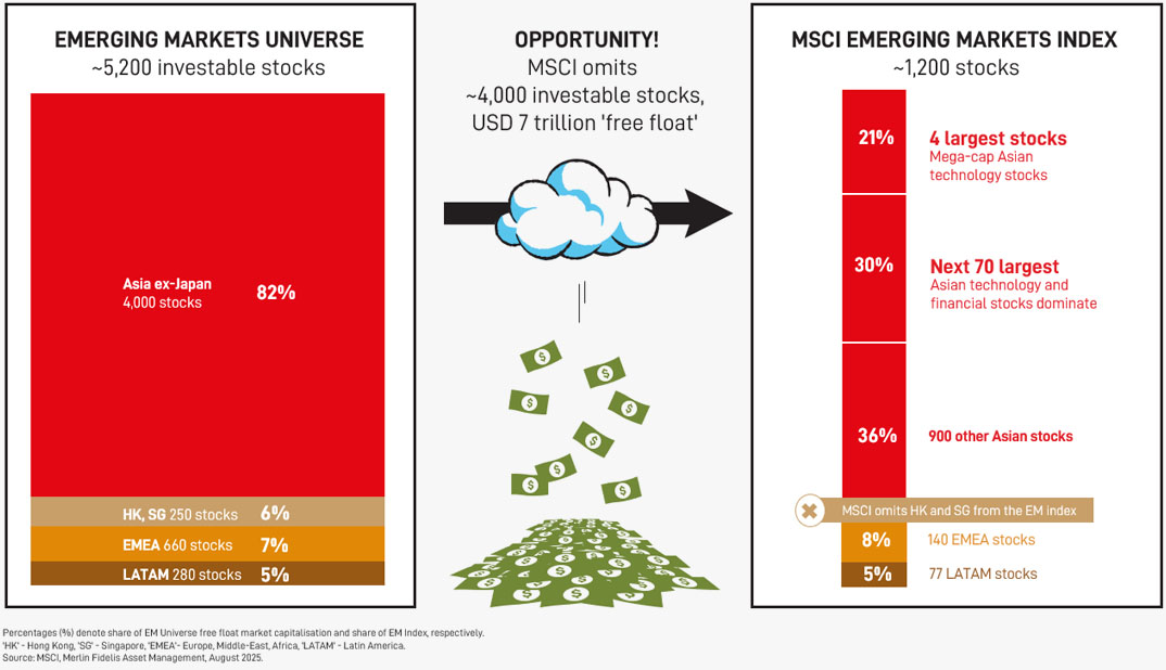 The diversity of companies in the Emerging Markets universe will inevitably comprise stocks with contrasting fundamentals and their mispricing – ideal conditions for active management! Meanwhile the index which attracts passive investment flows is heavily biased to very large companies and a few cyclical sectors (see below).